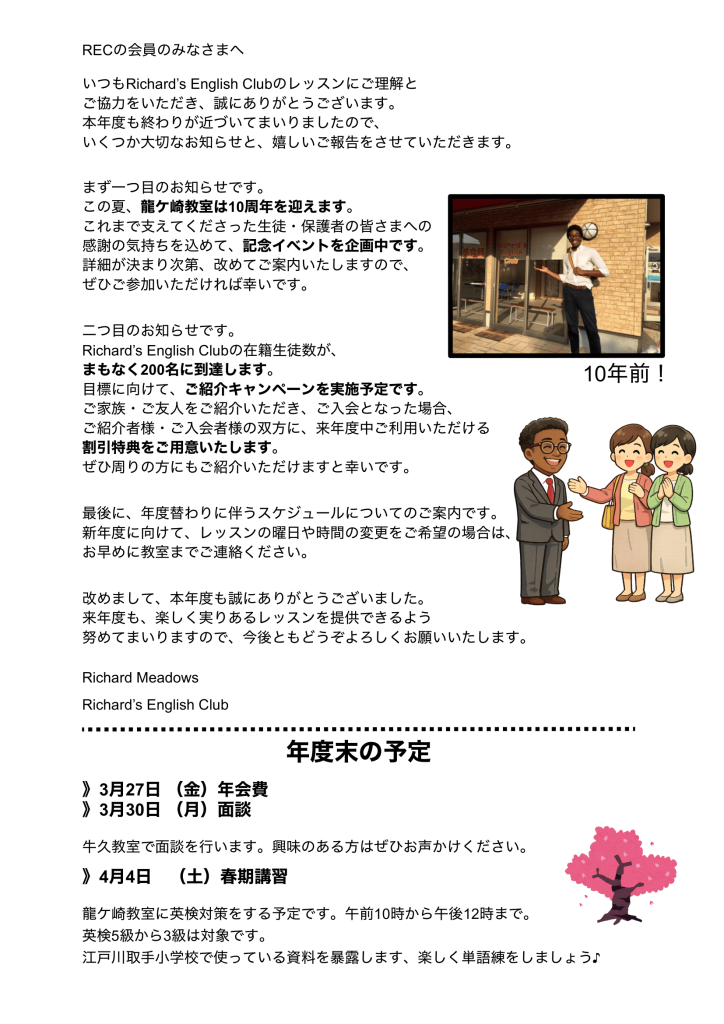 ホーム コース・料金について レッスンスケジュール 生徒さんの声 受講までの流れ 他の教室との違い Q&A 教室案内 ブログ お問い合わせ 0297-63-4400 contact BLOG ホーム ブログ 令和7年度末の挨拶 2026.02.28令和7年度末の挨拶 « 前へ一覧へ戻る 次へ »